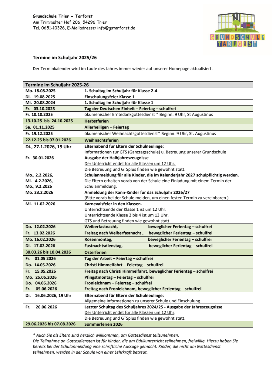 Termine Termine im Schuljahr 2025/2026 Hinweis: Angegeben ist jeweils der erste bzw. letzte Ferientag.Am letzten Schultag vor den Sommerferien sowie am Tag der Ausgabe der Halbjahreszeugnisse endet der Unterricht in allen Klassen um 12.00 Uhr (auch für GTS).Die Betreuung findet wie gewohnt statt.